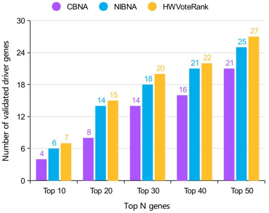 We compared HWVoteRank with NIBNA and CBNA, two of the most popular methods for identifying coding and non-coding cancer drivers, in the number of predicted cancer driver of gene with mutations in the top 50 genes. The comparison results are shown in Figure 4. It is demonstrated that the proposed HWVoteRank approach outperforms the other two methods in top 50. Therefore, methods based on key node identification can effectively identify cancer drivers of genes with mutations. It is a novel development direction to identify cancer drivers in biological network by the algorithms for identifying the key nodes in the network.
