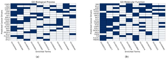 Figure 5. The heatmaps of (a,b) show enrichment profiles for GO biological processes and GO molecular functions, respectively.