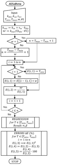 The AlphaBeta is a software module for calculating and parameters. AlphaBeta was conceived by means of the Delphi environment and is presented as a flow chart in Figure 1 and Table 1, with the following remark: if the rough pass and finishing pass are made by the same tool, the tool life from Equation (10) must be considered as a combination between the rough tool life and finishing tool life.