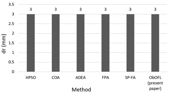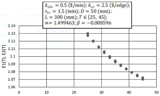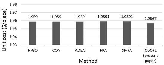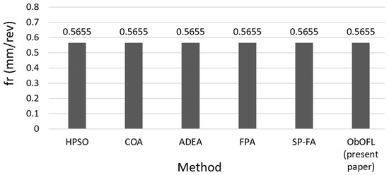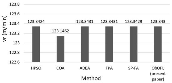 The Equations (50) and (51) were used by the methods from Table 4, less by the proposed method (ObOFL). For the proposed method Equation (13) was used. In this case or are obtained by convenient establishment of the parameter . For making the comparison of the results the same must be used. For the case of Equation (50) this is possible, meaning that can be determined. For the case of Equation (51) a correlation between and cannot be done. For this reason, the evaluation of the validity of the proposed method must consider only the case when considering given by Equation (50). Comparing the unit costs, as well as the machining parameters from Table 4, it might be considered that the proposed method is as good as the analyzed methods (Figure 2, Figure 3, Figure 4 and Figure 5).