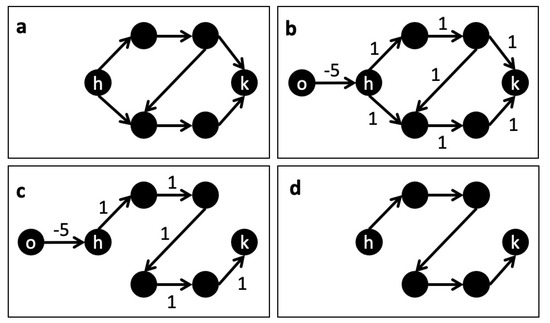 Figure 1 shows an example useful to understand Proof of Theorem 1. In Figure 1a, a direct graph (i.e., G) with six nodes is depicted, while in Figure 1b, a graph derived from G is represented: node o has been added together with the weights for the arcs. In Figure 1c, the solution for the is shown. Finally, the Hamiltonian path from node h to node k, is depicted in Figure 1d).