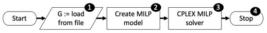 The model has been implemented in Java, using CPLEX version as a solver. The computational tests were performed on a MacBook Pro, with a 2.9 GHz Intel i9 processor and 32 GB of RAM. Figure 4 shows the flow chart of the proposed approach. Step 1 load the input graph from the text file. Step 2 creates the mathematical model. Its complexity depends on the number of constraints created, which is in the order of . Using the solver of the software, in Step 3, the problem is solved. The computation time for Step 3 is exponential [24] as stated in Theorem 1. In Step 4, all the values associated with the model decision variables are extracted to create a textual representation of the solution.