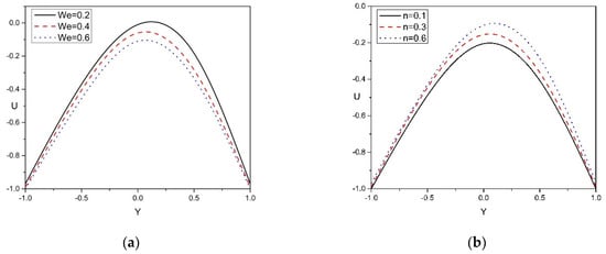 The impact of , , , , , and  on velocity profile  are presented in Figure 2a–g. Figure 2a shows that velocity in peristaltic pumping decreases with an increase in . Physically, the Weissenberg number is the ratio of the relaxation time of the fluid and the specific process time. It grows with the thickness of fluid, and that is why the velocity of the fluid depreciates. Figure 2b explains the influence of the power-law index on the velocity profile, increasing the values and reducing the non-Newtonian behavior of the flow, and this leads to an enhancement of the momentum boundary layer. Figure 2c illustrates that the velocity in peristaltic pumping enhances with a rise in Brinkman number . In addition, Figure 2d shows that enhancing the thermal Grashof number  decreases the velocity of the liquid.  satisfies the proportionate influence of viscous hydrodynamic force and thermal buoyant force. In Figure 2e, an increase in the solutal Grashof number  decreases the velocity distribution of the wall, as it influences the shrinkage of the thermal boundary layer. From Figure 2f,g, it can be observed that the velocity in peristaltic pumping rises with an increase in , due to the buoyancy force, which dominates within the boundary layer, as  depends upon density, which decreases with increasing temperature. The buoyancy ratio is the ratio of fluid density contributions by the two solutes.