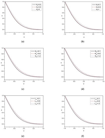 Figure 3a–g are prepared to represent the temperature profile via , , , , , , and . Figure 3a–f demonstrates that the temperature distribution rises when there is a rise in , , , , and , respectively. Figure 3a demonstrates that the temperature distribution rises when there is a rise in  because the arbitrary movement of the nanoparticle is increased as  is increased, causing more heat in the liquid and thus enhancing the liquid’s temperature. From Figure 3b, it can be observed that the temperature distribution rises when there is a rise in . Furthermore, the presence of nanoparticles in the fluid is represented by these two parameters. Because these particles increase the fluid’s thermal conductivity, the temperature rises, and the thermal boundary layer thickens. From Figure 3c,d, it can be noticed that temperature distribution increases for the larger varying values of the modified Dufour parameters  and . Thermal conductivity rises as thermal diffusivity rises, leading to an increase in molecular vibrations, and as a result, the temperature increases. From Figure 3e,f, it can be noticed that the temperature distribution increases for the larger varying values of Dufour solutal Lewis numbers  and . Within the boundary layer, both the dimensionless temperature and Dofour solutal Lewis number are inversely proportional to the concentration difference at the wall. Therefore, the greater the Dofour solutal Lewis number, the larger will be the temperature distribution. Figure 3g represents the effect of the power-law index  on the temperature distribution. The rise in the power-law index decreases the temperature distribution due to the reduced non-Newtonian behavior of the flow, and this leads to an enhancement of the momentum boundary layer.