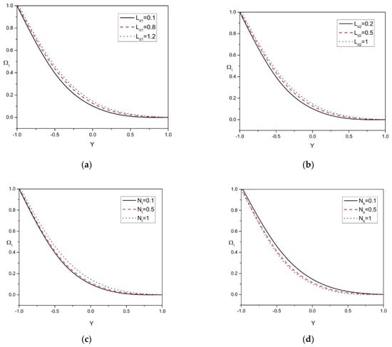 Figure 4a–e shows that the solutal concentration profile 1 of the nanoparticle is influenced by , , , , and . Figure 4a,b shows that solutal concentration profile 1 in peristaltic motion increases by rising the values of  and . Within the concentration boundary layer, both the solutal concentration 1 and Dofour solutal Lewis number are inversely proportional to the concentration difference at the wall. Therefore, the greater the Dofour solutal Lewis number, the larger will be solutal concentration 1. As a result of increased mass diffusivity, these parameters show a significant increase in solutal concentration profile 1 of the nanoparticle. Higher mass diffusivity indicates a higher possibility of molecular collision due to a large difference in solutal concentration. The difference in the solutal concentrations of molecules grows as the concentration gradient gets higher. Figure 4c shows that solutal concentration profile 1 in peristaltic motion increases by rising the values of . Figure 4d shows a substantial decrease in solutal concentration profile 1 of the nanoparticle by enhancing the Brownian motion parameter . Brownian motion is based on a random motion of liquid elements moving across a flow surface as nanoparticle movement is pushed from the hot region to the cold region, which results in a decrease in concentration distribution. Figure 4e presents the effect of the power-law index  on the solutal concentration profile 1: a rise in the power-law index decreases the solutal concentration profile 1 due to the reduced non-Newtonian behavior of the flow, and this leads to an enhancement of the momentum boundary layer.