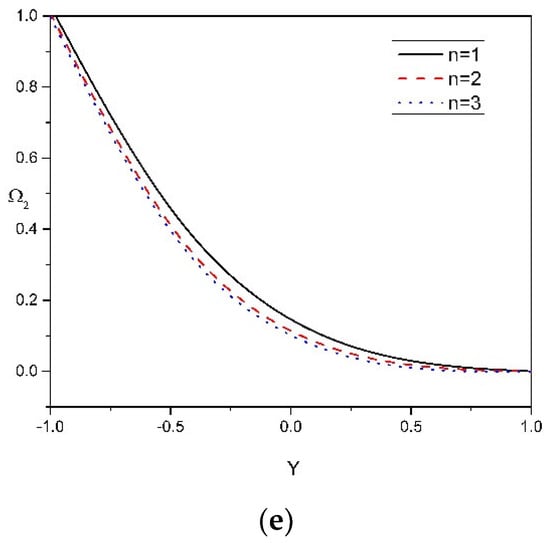 Figure 5a–e show the solutal concentration profile 2 of the nanoparticle is influenced by , , , , and . Figure 5a,b show that solutal concentration profile 2 in peristaltic motion increases by raising the values of  and . Within the concentration boundary layer, both the solutal concentration 2 and Dofour solutal Lewis number are inversely proportional to the concentration difference at the wall. Therefore, the greater the Dofour solutal lewis number, the larger will be the solutal concentration 2. As a result of increased mass diffusivity, these parameters show a significant increase in solutal concentration profile 2 of the nanoparticle. Higher mass diffusivity indicates a higher possibility of molecular collision due to a large difference in solutal concentration. The difference in the solutal concentrations of molecules grows as the concentration gradient gets higher. Figure 5c demonstrates that solutal concentration profile 2 in peristaltic motion increases by rising the values of . Figure 5d shows a substantial decrease in solutal concentration profile 2 of the nanoparticle by enhancing the Brownian motion parameter . Brownian motion is based on a random motion of liquid elements moving across a flow surface as nanoparticle movement is pushed from the hot region to the cold region, which results in a decrease in the concentration distribution. Figure 5e presents the effect of the power-law index  on the solutal concentration profile 2. The rise in power-law index decreases the solutal concentration profile 2 due to the reduced non-Newtonian behavior of the flow, and this leads to an enhancement of the momentum boundary layer.