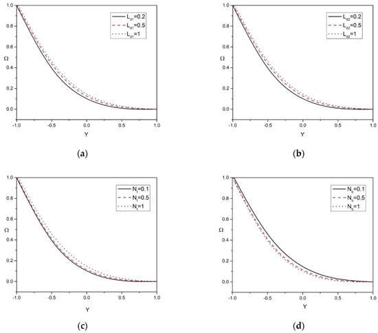 Figure 6a–e show that the solutal concentration profile of the nanoparticle are influenced by , , , , and . Figure 6a,b shows that the solutal concentration profile in peristaltic motion increases by raising the values of  and . Within the concentration boundary layer, both the solutal concentration and Dofour solutal Lewis number are inversely proportional to the concentration difference at the wall. Therefore, the greater the Dofour solutal Lewis number, the larger will be the solutal concentration. As a result of increased mass diffusivity, these parameters show a significant increase in the solutal concentration profile of the nanoparticle. Higher mass diffusivity indicates a higher possibility of molecular collision due to a large difference in solutal concentration. The difference in the solutal concentrations of molecules grows as the concentration gradient gets higher. Figure 6c demonstrates that the solutal concentration profile in peristaltic motion increases by rising the values of . Figure 6d shows a substantial decrease in the solutal concentration profile of the nanoparticle by enhancing the Brownian motion parameter . Brownian motion is based on a random motion of liquid elements moving across a flow surface as nanoparticle movement is pushed from the hot region to the cold region, which results in a decrease in concentration distribution. Figure 6e presents the effect of the power-law index  on the solutal concentration profile: a rise in the power-law index decreases the solutal concentration profile due to the reduced non-Newtonian behavior of the flow, and this leads to an enhancement of the momentum boundary layer.