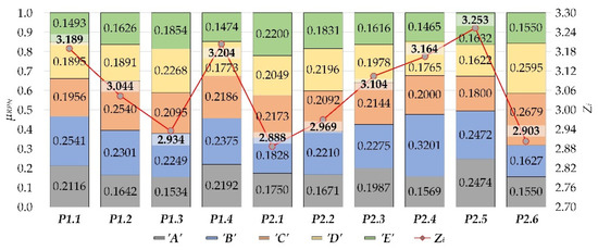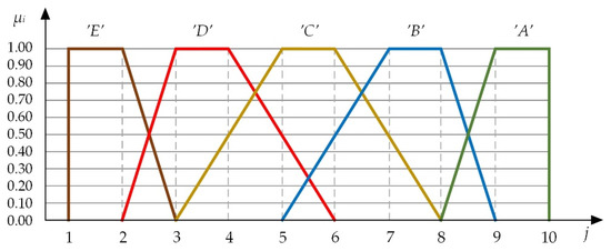 The fuzzy number is converted into a real number by the process of defuzzification. The output values of the identification procedure are arranged according to the grades (µi = ‘A’, ‘B’, ‘C’, ‘D’, and ‘E’). These values are combined into a final assessment that becomes comparative. The method of defuzzification that is used in this paper is the centre of mass (Zn) method [13,39,79]. The grade ‘A’ is assigned a value of Ci = 5. The remaining grades fall until grade ‘E’, which gets a value of Ci = 1 [80]. The value (Zn) is obtained according to the Equation (19):