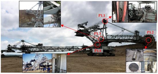 An analysis of the background of serious failures (damages) and excavator downtimes was performed [23,24,25]. From the aspect of accident risk, four weak points are located that are characteristic for this type of excavator (Figure 3):