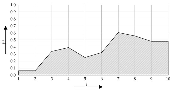 Five linguistic variables are introduced for each PI and risk as an overall indicator, which is defined in the coordinate system of the membership function (µ) and the class as the representative of the unit of indicator measure (j = 1 to 10) [60,61,62]. Linguistic variables are presented as fuzzy sets. Fuzzy sets are in a trapezoidal shape. This shape is applied for the linguistic variables for which there is no clear and precise difference between the fuzzy terms [17,63]. The linguistic variable (LV) is in the following form: