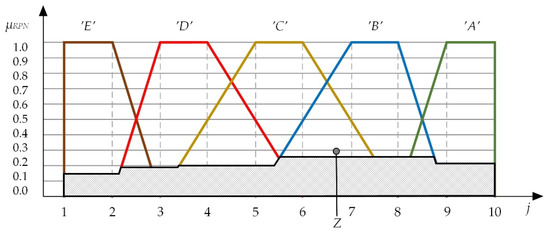 Each μRPN (‘A’, …, ‘E’) represents the extent to which RPN belongs to the defined risk fuzzy sets expressions (1). It can be noted that if RPN completely belongs to a certain expression, then μRPN(‘A’, …, ‘E’) is equal to 1 and the others are equal to 0 [63]. Thus, μRPN (‘A’, …, ‘E’) could be viewed as a degree of confidence that RPN belongs to the certain risk expressions defined to the procedure of proposition (Section 3.1).
