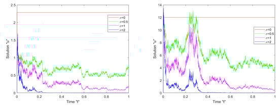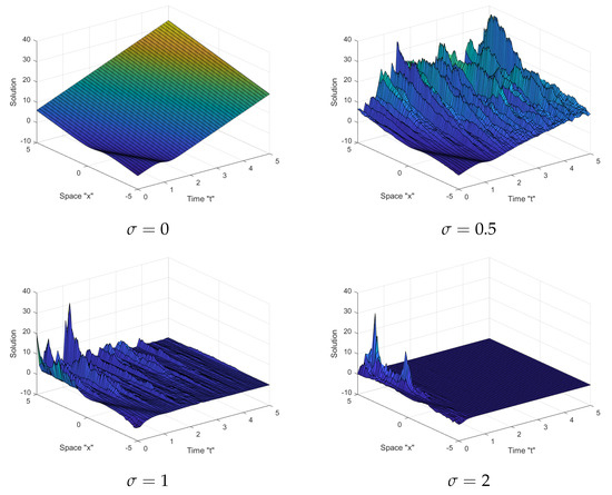 We demonstrate here the impact of the Wiener process on the analytical solutions of the SBSE (1). The following are some graphs of the behavior of these solutions. We plot the solutions (27), (33) and (39) for various (noise intensity) and fixed parameters and (or by using the MATLAB package, for and as follows: