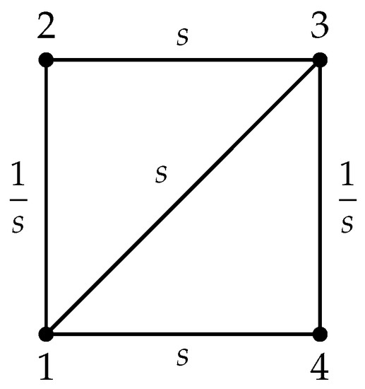 We consider the graph with vertex set as in Figure 1. We choose where . Along each edge, the label in the figure is its admittance.
