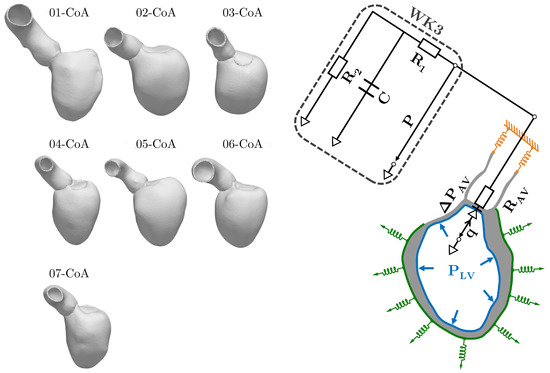 Figure 1. (Left), seven patient-specific anatomical models of the left ventricle (LV) and the aortic root from patients treated for aortic coarctation (CoA); (right), mechanical and afterload boundary conditions where Neumann-type pressure boundary conditions are illustrated in blue and Robin-type boundary conditions are illustrated in green (uni-directional springs that mimic the effect of the pericardium) and yellow (omni-directional springs). The mechanical model is coupled to a 0D three-element Windkessel model (WK3) that accounts for afterload conditions. Here, R 1 , R 2 are the characteristic and peripheral resistances, respectively, and C is the arterial compliance. Pressure is denoted by P and the relationship between pressure and flow q = d V d t across the aortic valve (AV) is represented by a 0D diode model, where R AV is the respective resistance. The diode model of the flow across the mitral valve and the uni-directional springs that are applied to the septum are not shown. See [18] for more details.