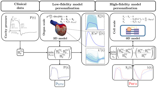 Figure 2. Conceptual illustration of the two-step multi-fidelity approach for personalising biophysically detailed active mechanics models. In the first step, the active mechanical behaviour in the given 3D EM model is described by a low-fidelity model (LFM). This is personalised at the organ scale by minimising the difference between simulated (sim) and clinical (clin) pressure biomarker values ( B P ) that are obtained from an available clinical cavity pressure trace. Median traces of nodal cellular active stress ( S a ), intracellular calcium concentration ( [ C a 2 + ] i ), and fibre stretch ( λ ) are then obtained from the simulation that was produced by the personalised 3D EM models. These are utilised to personalise the high-fidelity model (HFM) at the cell scale in the second step. To this end, the HFM model is integrated in an 0D EM model that simulates the stretch of the cardiomyocyte during the cardiac cycle based on the equilibrium of active and passive stress. The median trace of nodal [ C a 2 + ] i is used as input but [ C a 2 + ] i can also be generated from a coupled model of [ C a 2 + ] i evolution that is integrated in the chosen cellular EP model. Personalisation is done by minimising the difference between simulated (sim) and target (tar) biomarker values that are obtained from the median traces of nodal cellular active stress ( B S a ) and fibre stretch ( B λ ). The parameters of the LFM and the HFM are denoted by p LFM and p HFM , respectively. Please note that the fibre stretch in the relaxed state is 1 per definition (Section 2.3.1 and Appendix A.3).