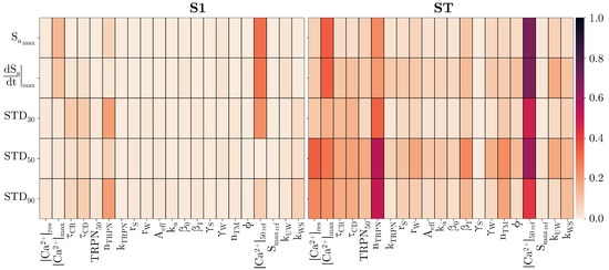 The variance-based Sobol’ GSA [57,58] was used to identify the parameters that the chosen active stress biomarkers are most sensitive to in the 0D EM model. In general, when the model inputs are varied, it measures the sensitivity of the model outputs to each model input by the fraction of variance attributed to each model input alone (first-order sensitivity index S 1 ) or by the fraction of variance attributed to each model input including interactions with the other model inputs (total-effect sensitivity index S T ). The Sobol’ GSA is based on an all-at-a-time sampling strategy and the sensitivity indices range from 0 (no sensitivity) to 1 (maximum sensitivity).