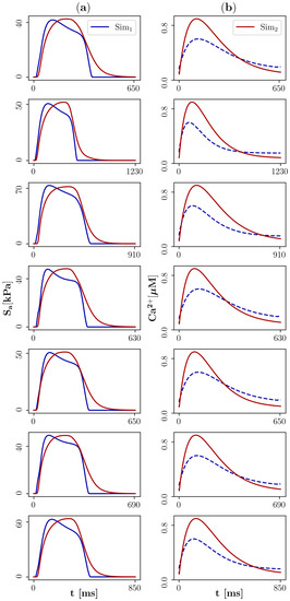 In this study, the 0D model of cellular EM consisted of the Land models of cellular active stress (Appendix A.2) and passive stress evolution (Appendix A.3), and the Rice model that describes the evolution of  [ C a 2 + ] i on a purely phenomenological basis (Appendix A.4). Both the Land model of cellular active stress evolution and the Rice model were personalised and to this end, the following active stress biomarkers were used to set up the minimisation problem: B S a = { S a max , d S a d t | max , S T D 30 , S T D 50 , S T D 90 } (Appendix C).