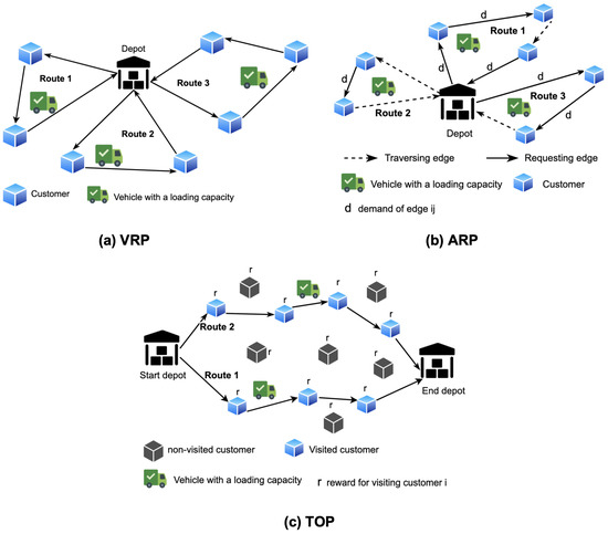 The ARP is a routing problem that has been known since 1960. It is based on the Chinese postman problem [27] and the rural postman problem [28]. Figure 1b shows a schematic representation of a basic ARP. There is a depot from which routes start and end, a homogeneous fleet of vehicles, as well as a set of nodes and edges. In these problems, some arcs or edges may require service (required arcs), and other arcs or edges are only traversed to reach the required arcs. Each required arcs has an associated positive demand, and it is traversed by at least one vehicle; each vehicle has a specific route associated with it. Traversing arcs assume a null demand with no impact on the result. The typical objective function minimizes total costs of designed routes that satisfy the demands of the arcs. These costs can be defined in monetary, time, or distance units.