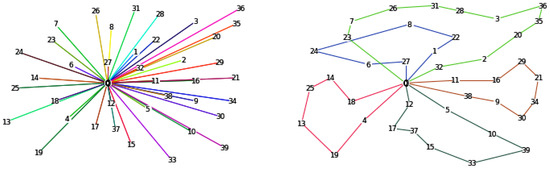 Next, an iterative merging process is carried out starting from the initial solution. The savings list is iterated, and, in each iteration, the next edge is considered. If nodes linked by an edge are currently visited by two different vehicles and the merging would respect all the constraints (such as the capacity of vehicles), then the vehicles’ routes are merged into one. This process terminates when the savings list is concluded, the number of vehicles is under a certain threshold, or other user-defined stopping conditions are met. For the sake of clarity, the evolution of the solutions from the starting to final solutions in two benchmark instances is represented in Figure 2.