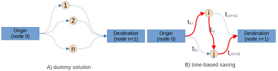 First, the PJS heuristic generates a dummy solution in which one route per customer is considered—i.e., for each customer , a vehicle departs from the depot (node 0), visits i, and then concludes the trip at the destination depot (node ). In this dummy solution, if a route does not satisfy the driving-range constraint, the associated customer is discarded (and not visited), since it cannot be reached with the current fleet of vehicles.