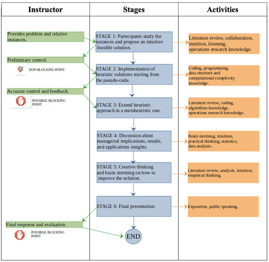 The way in which we organized the activity in this course is described next and, to our best knowledge, might be generalized as a standard approach to be used. For each of the previously described optimization problems, the instructor selects instances of different sizes and characteristics and, hence, instances with different degrees of difficulty (the use of exact optimization methods is usually limited to the smallest degrees of difficulty). Then, students are organized in small teams of three or four members. Whenever possible, these teams are interdisciplinary (i.e., composed of students with heterogeneous backgrounds, including industrial engineers, mathematicians, computer scientists, or students from business and management studies). Each of these teams has to work on the following stages, with the support and guidance from the instructor (the instructor’s role might depend upon students background and the expected learning outcomes of the game):