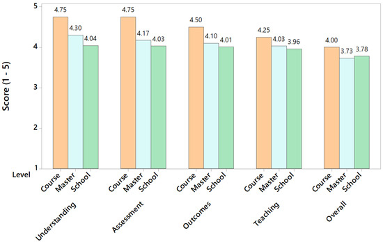 Apart from these samples of students’ qualitative feedback, Figure 5 shows the result of a student survey on one of the courses implementing the serious game activity. This survey registers students’ opinions, measured in an interval from low 1 to high 5, in several dimensions: understanding of the content, assessment activities, learning outcomes, teaching quality, and overall opinion. As one can notice, the average scores provided by the students for the course in which the serious game activity was included are clearly above the scores assigned to the entire master and the entire school.