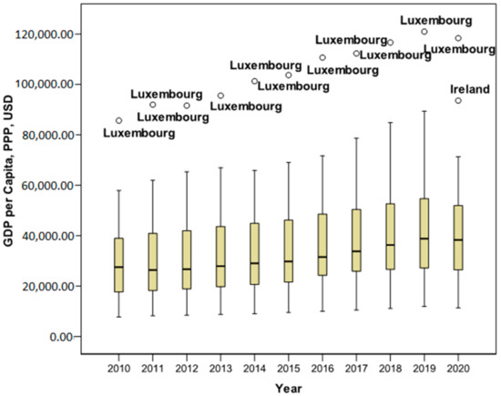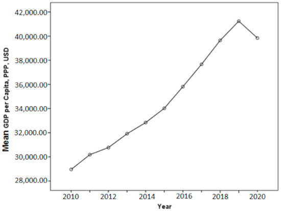 In 2020, the macroeconomic indicators were undoubtedly affected by the pandemic. We reflected its impact on GDP per capita PPP in Figure 10. In addition, we took into account the impact of the pandemic in our multivariate analysis by introducing two variables: the GDP Annual Growth Rate Previous and the GDP Annual Growth Rate Last. It is explained by the change in the values of the variables during a pandemic. A detailed study of the impact of the pandemic requires serious investigation that we plan to do in our following paper.