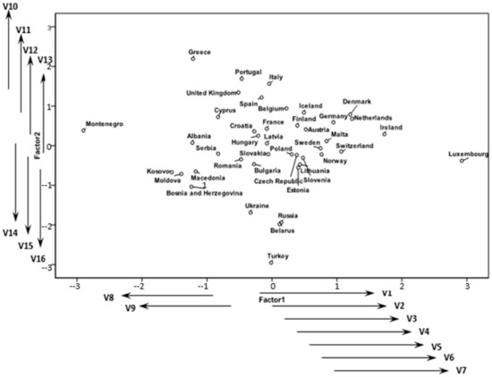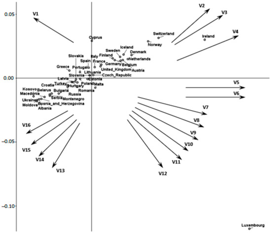 Figure 9. General view of the economic situation of European countries. V1—GDP per capita PPP, V2—Trade Balance, V3—Current Account to GDP, V4—Saving Rate, V5—Personal Income Tax Rate, V6—Corporate Tax Rate, V7—Retirement Age Women, V8—Unemployment Rate, V9—Net External Debt, V10—Retirement Age Men, V11—Sales Tax Rate, V12—Government Debt to GDP, V13—GDP Annual Growth Rate, Last, V14—Interest Rate, V15—Inflation Rate, V16—GDP Annual Growth Rate, Previous.
