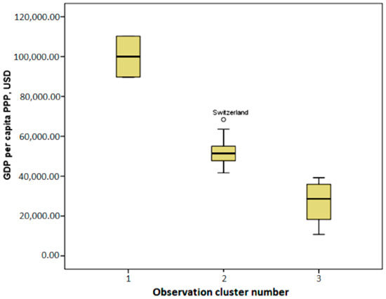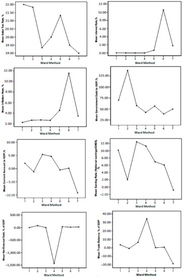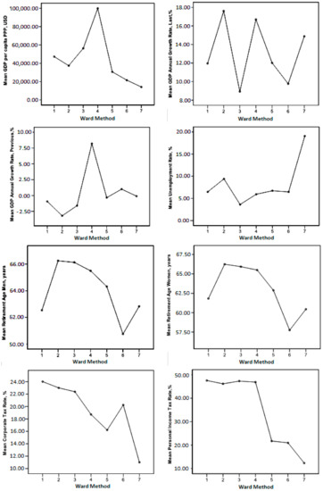 Each cluster has its most significant characteristics, by which we can judge the distinctive economic characteristics of the countries included in this cluster. For example, the countries of the first cluster are distinguished by high values of taxes determined by the variables Corporate Tax Rate, Personal Income Tax Rate, and Sales Tax Rate and low values of the variables Interest Rate and Inflation Rate.