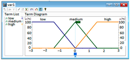 As input variables, we take the three principal components obtained in the previous section as the result of factor analysis, Factor 1 (var1), Factor2 (var2), and Factor3 (var3). The values of these variables range from −3 to 3 since these variables are reduced to normal standard distribution with parameters (0; 1). We break these variables into three grades: low, medium and high.