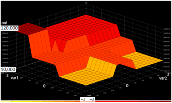 Figure 16. 3D graph of the function out (var1, var2) in case of only two variables.