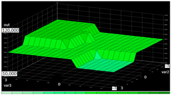 Figure 13, Figure 14 and Figure 15 show 3D graphs of the functions out (var1, var2); out (var1, var3); out (var2, var3), respectively.
