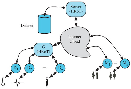 The main entities of a telehealth system are: (a) A server that could be a hospital or medical center, and naturally considered a hardware root-of-trust (HRoT) due to the layered security measures implemented. (b) Internet cloud, which is, in general, an insecure communication medium. (c) A gateway that provides an interface between the IoT edge devices and the internet. (d) Edge IoT devices that comprise sensors and actuators to measure and deliver medications to remote patients. (e) Mobile devices that allow healthcare practitioners (doctors/nurses) to remotely connect to the telehealth system. It is clear from the figure that there are many opportunities for attacks due to the use of diverse hardware platforms, diverse operating systems, insecure wireless communication media, limited processing power for many system entities, and the sheer number of people involved in the operation of the system [3,4].