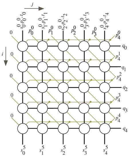 Using reference [21], the dependence graph DG describing the modular multiplication can be obtained from Equations (8) and (10). The indices i and j in the two equations designate that the DG can be defined in a two-dimensional integer domain. Index i denotes the rows, and index j denotes the columns. Figure 2 presents the DG for the field size . The circled nodes compute the operations depicted by Equations (8) and (10). The vertical lines represent the partial product signal , the multiplier signal , and the irreducible polynomial coefficient . The horizontal lines represent the broadcast multiplicand signal . The diagonal lines represent the signal . Signals and requires signals and to be computed. The last column nodes produce signal , which is used inside the column nodes, and broadcasted to the remaining row nodes as indicated in Figure 2.
