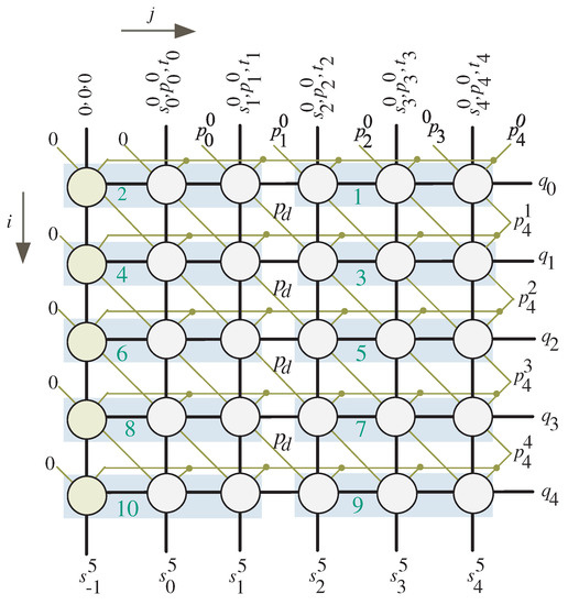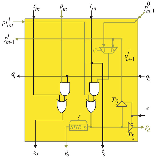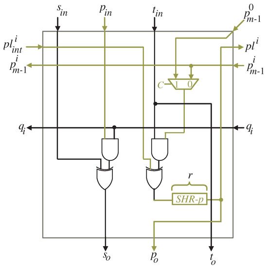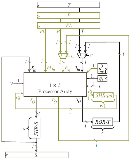 Observation of Figure 3 and Figure 4 indicates that the rightmost bit of register P is transferred diagonally to the following node after delayed by time steps, where , while the remaining vertical and slanted word bits of P are transferred to the following bottom nodes after being blocked by r time steps. Therefore, bit should be passed through the shift-right register, SHR-pd, that has depth size as shown in Figure 4. Shift-right registers SHR-P and SHR-S, and rotate-register RoT-T all have the same width and depth sizes of l and r, respectively.