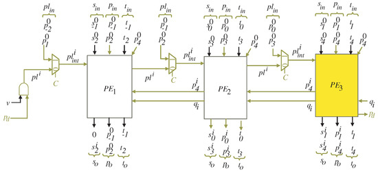 Figure 5 displays the details of the processor array block for the case bits. The processor array contains two types of PEs. Figure 6 and Figure 7 depict the design details of the PEs. All the PEs are interconnected in a pipeline structure to perform computing at the same time. The yellow PE in Figure 3 has two more tri-state buffers managed by the control signal e. We will discuss below the role of these extra buffers.