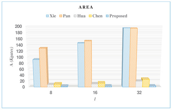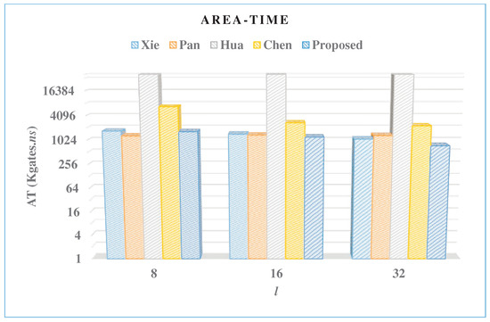 Figure 9 displays the obtained area–time (AT) results of the proposed design and the adopted word-serial ones. We can read the results based on the different word-sizes l as follows:
