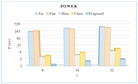 Figure 10 shows that proposed multiplier structure achieves a significant reduction in power consumption ranging from 74.3% to 99.6% at , 64.1% to 99.44% at , and 73.9% to 99.4% at compared to the other multiplier designs. The reduction of power is attributed to the lower area complexity of the proposed design over the other designs. The reduction in area reduces the total amount of parasitic capacitances, resulting in a significant reduction in switching activities, which is one of the primary sources of consuming power.