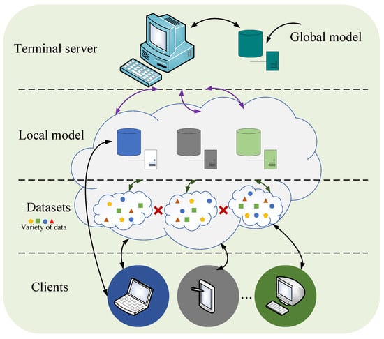 Federated learning [1,2,3] is a particular type of distributed machine learning. Figure 1 shows the framework of federated learning. FL enables multiple clients to perform joint training under the premise of ensuring that data are not shared. Only local model training parameters are shared in the training process. A client is no longer a single individual, and the client can thoroughly learn the training experience from others. This approach provides a possible solution to data island problems. McMahan et al. [4] proposed the Federated Average (FedAvg) algorithm. They were the first to propose a relatively complete federated learning framework based on deep learning. The framework takes full account of the common Non-Independently Identically Distributed (Non-IID) data and communications costs in FL. FedAvg evaluates its performance on five different models and four datasets. The combination of FL [5,6,7] and Deep Learning [8,9,10,11,12] has opened a new world of research.