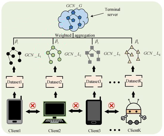 This section first introduces the proposed graph convolutional neural network with a cross-layer fusion structure as the local federated learning model. A federated aggregation algorithm based on an attention mechanism is then proposed to generate an efficient global model. Figure 2 is the federated learning system framework proposed in this paper.