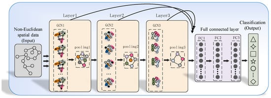 To give the FedGCN the ability to process non-Euclidean spatial data, this section proposes a graph convolutional neural network as a local model of the federated learning client. The GCN is mainly divided into three parts: a convolutional graph layer, a graph pooling layer, and a fully connected layer. The graph convolution layer aggregates the features of the node and its neighbor nodes through the graph convolution operation. The graph convolution layer extracts the effective features of the non-Euclidean spatial data; the graph pooling layer executes the graph pooling operation and selects the best values of various features after the graph convolution layer as representatives to represent new node features. The graph convolution layer output’s feature dimension is effectively reduced, as subsequent graph convolution operations or fully connected layer classification provide high-quality parameters. In the fully connected layer, after several graph convolution and graph pooling operations, more efficient features are obtained. Unlike the classic graph convolutional neural network, which only relies on the SoftMax function to output classification results, three fully connected layers are used here to complete the task of graph classification. The specific process is shown in Figure 3.