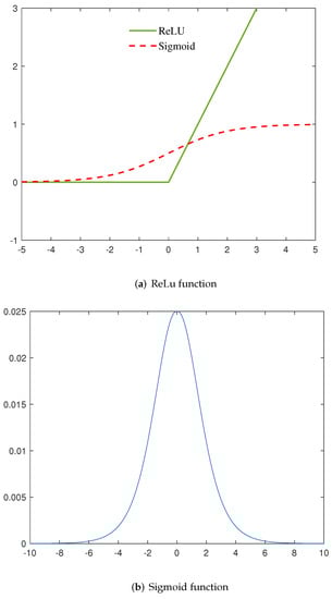 From Figure 4 and Equation (4), it is not difficult to see that the output value range of the sigmoid function is between 0 and 1. It has good symmetry and is convenient for derivation. It can output smoother values for classification tasks. However, the sigmoid function’s partial derivative will disappear when the input value is very large or very small, so the sigmoid is only used in the last fully connected layer to output the classification results. The ReLU activation function is used in the middle layer of the graph convolutional neural network to prevent the gradient from disappearing.