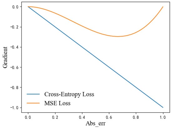 Compared with a simple loss function such as the mean squared error, the cross-entropy loss function can better adjust weights. When the absolute error (the deviation between the predicted value and the true value, that is, ) is very large, the model converges very slowly or does not converge at all. Figure 5 shows the relationship of the absolute error and gradient between the cross-entropy loss function and the Mean Squared Error (MSE) loss function during the training process. Suppose there is a set of data , where , is constantly changing, and b is always fixed at 0.2. When changes, the absolute error and the gradient of are recorded. The absolute error is the abscissa, and the gradient is the ordinate. It can be clearly seen in Figure 5 that the absolute error in the cross-entropy loss function is proportional to the gradient. That is, the smaller the absolute error, the smaller the gradient. As the absolute error in the mean square error loss function increases, the gradient is distorted, which will cause the model to fail to converge. Based on these advantages, this paper uses the cross-entropy loss function.