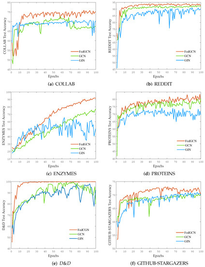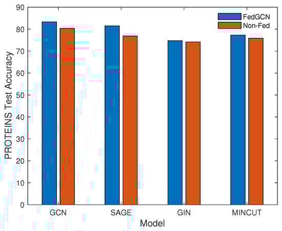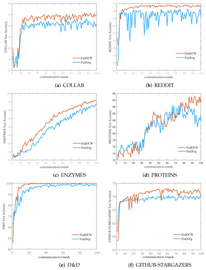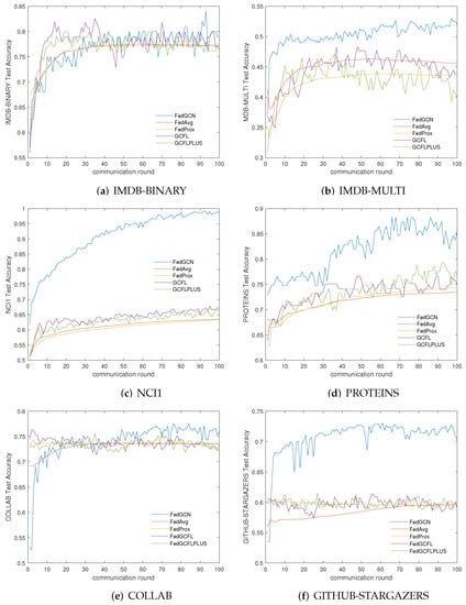 In order to verify that the algorithm FedGCN proposed in this paper has excellent accuracy, experiments were carried out on various non-Euclidean spatial datasets. Figure 7 shows the performance comparison of FedGCN, GCN, and GIN models. The FedGCN local model is constructed in Section 3.1, and the GCN also corresponds to the graph convolutional neural network constructed in Section 3.1. Experiments verified the effectiveness of the FedGCN in processing non-Euclidean spatial data. Moreover, compared with the classical GCN model, the GCN constructed in this paper, by adding a TopK pooling layer, a full connection layer, and a cross-layer fusion module, has better accuracy and stability. The experimental analysis is mainly based on each algorithm’s accuracy performance on various datasets (the accuracy is obtained by testing on the test dataset after each round of communication).