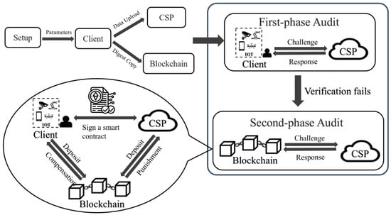 - The client has a large amount of data and needs to outsource this data to the CSP for maintenance and computation but does not save the copy locally. It also stores a file digest copy on the blockchain. Then, the client challenges the CSP and verifies the response coming from the CSP. If the response from the CSP passes verification, the outsourced data are considered complete; otherwise, they are considered incomplete. This case will trigger the blockchain to perform public auditing for fair judgement.