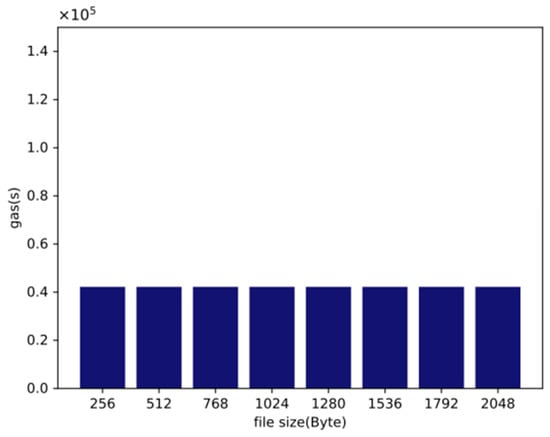 The overhead of the smart contract comes from the posting parameter and on-chain verification. In this scheme, there is just one parameter named which is used for on-chain verification. Figure 4 measures the gas costs of different sizes of files that were used in our auditing scheme. It is shown that the cost of our contract implemented on Ethereum was a constant value. The gas cost was fixed at . The total cost of ether could be calculated by the Ethereum gas rule: . The average gas price was about 45 Gwei, and 1 Gwei is ether. The current exchange rate is 1 ether = USD 2500. As shown in Figure 4, our cost for deploying the auditing scheme model was about USD 4.7493. The results confirm that this was not a huge cost for the client.