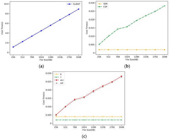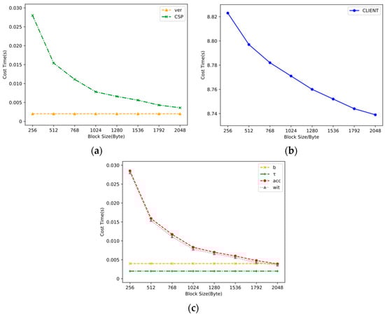The upload time of the client, the witness computation time of the CSP, and the verification time cost of the verifier should be considered. First, we fixed the size of the data file to 2 MB. The data file was generated randomly from 0–9, a–z, and A–Z in our testing. Both the base size of the data blocks and the size of each increment were designed to be 256 bytes. When the block size was increased to 2 KB, the experiment would be stopped. For each round of experiments, we ran 100 tests with the same data and took the average as the result to reduce the error effect of a single experiment. Note that the larger the data block size, the fewer segments were divided, and the fewer labels were generated since the size of the data file was fixed. The final experimental results are shown in Figure 5a,b. It is not hard to observe that the upload time and the generation time of the witness were inversely proportional to the block size, and the time required for the verifier to conduct verification was fixed at 0.002 s, which conformed to our expectations. We can see that as the block size increased, the time required to calculate and decreased correspondingly, as shown in Figure 5c. Additionally, the order of magnitude of these parameters was about 0.01, well below the upload time. For the client, most of the time the cost was spent on encrypting the data file. Moreover, the calculation overhead of the parameters b (i.e., data segment) and τ (i.e., tag) was independent of the block size.