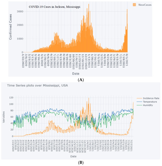 A sample of the time series of COVID-19 cases, temperature, and humidity over, Mississippi for the period of study 22 January 2020 to 4 August 2021, is shown in Figure 1A,B.