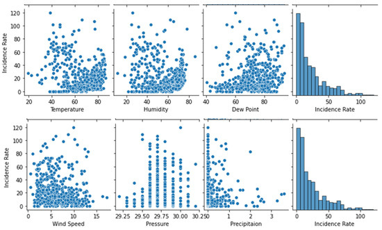The results of the cross-correlation analysis are shown in Table 3. A scatter plot of the COVID-19 incidence rate against each of the weather data variables (Temperature, Humidity, Dew Point, Windspeed, Pressure, and Precipitation) is shown in Figure 2.