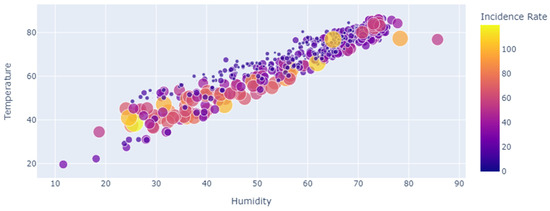 Figure 3 shows the correlation between humidity and COVID-19 cases in Jackson, MS, USA, as a function of temperature for the period of study 22 January 2020 to 4 August 2021.